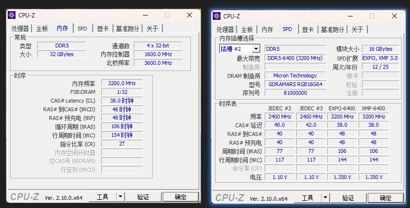 由CPU-Z检测得出,星幻DDR5 6400MT/s内存频率为3200MHz,支持EXPO和XMP 3.0一键超频,超频后对应时序均为38-48-48-106,电压为1.35V,属于一个不错的表现。