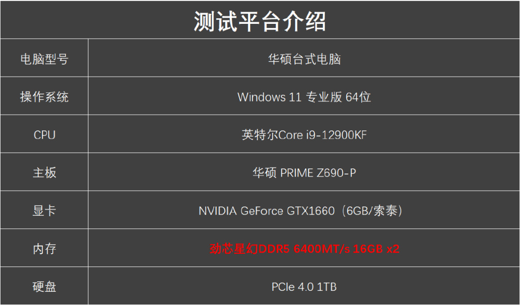 作为CPU和硬盘之间的重要桥梁,内存条的性能自然不能拉垮,以下为此次测试所用平台: