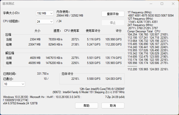 在7-zip基准测试中,星幻DDR5 6400MT/s压缩评分112GIPS,解压缩评分135GIPS,总体评分124GIPS。