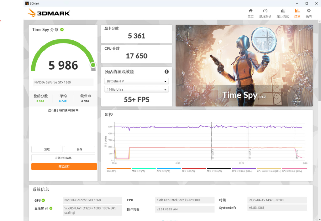 3DMARK中,星幻DDR5 6400MT/s开启XMP,电脑Time Spy分数为5986,预估玩2K分辨率的战地5,帧率可以达到55+FPS。