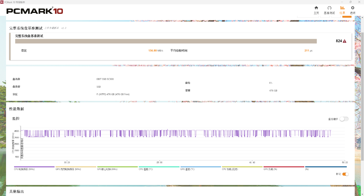 PCMark 10的磁盘基准测试主要用于模拟日常办公场景,追踪软件启动、系统开机等操作的性能表现。SC300在测试中获得总分824,平均带宽136.88 MB/s,平均存取时间为211 μs,表现稳定,能够满足日常办公和多任务处理需求。