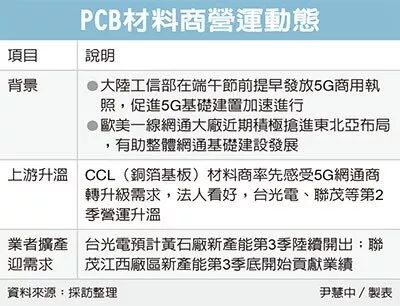 受惠于5G与网通急单挹注,PCB族群近期淡季不淡,6月营运有望持续提升,上游CCL(铜箔基板)材料商率先感受到5G商转升级需求,业内人士看好,台光电(2383)、联茂等指标厂本季营运升温之余,下半年业绩持续看俏,有望优于上半年。