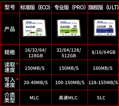 写入速度方面,则拉开了差距。从表中的数据看,采用SLC闪存的旗舰版(ULT系列)CF存储卡,写入性能在128-155MB/s,看来就算是8GB的旗舰版,写入速度也能轻松达到100MB/s。而专业版采用了高速MLC闪存芯片,写入速度高达90-150MB/s,而且最高容量达到惊人的512GB。ECO标准版从设计来看,应该是给入门级用户或者家用准备的产品,写入性能大幅降低,只有20-40MB/s。