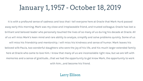 我们在马克赫德的官方网站看到了一封来自甲骨文CEO拉里-埃利森的信,信中说:”带着深深的悲伤和失落,我再次告知甲骨文的所有员工,马克-赫德今天早上去世了。马克是我亲密的、无可替代的朋友和值得信赖的同事。甲骨文失去了一位才华横溢、深受爱戴的领袖,他在甲骨文工作的十年间,触动了我们许多人的生活。我们都会想念马克敏锐的头脑和罕见的快速分析、简化和解决问题的能力……”
