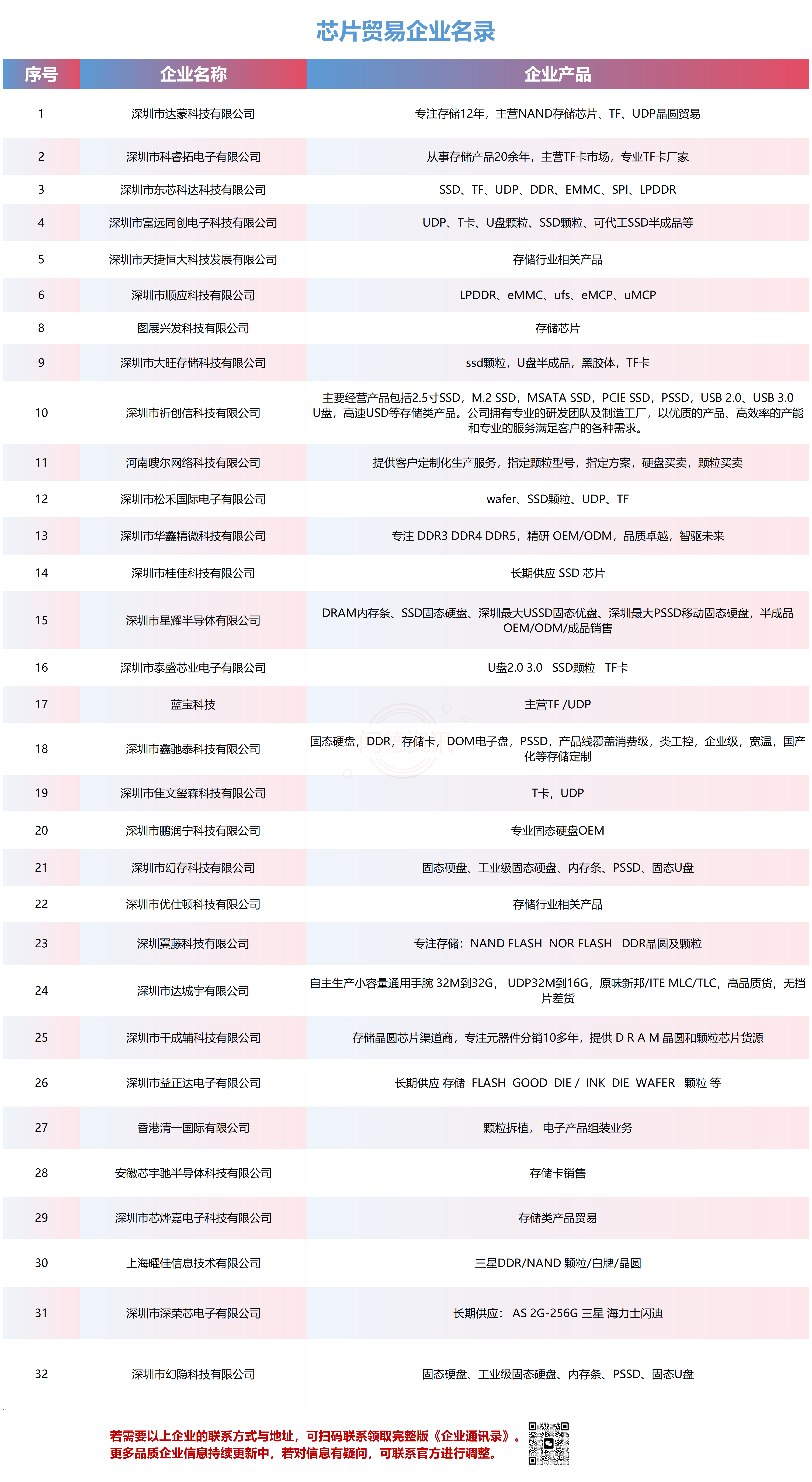 本行业品质企业名录收录了存储企业、OEM厂商、封测厂商、芯片贸易精英等信息,方便企业用户在此名录上寻找到合适的合作伙伴。同时也欢迎元器件企业、PCB企业、外壳配件企业、半导体设备企业等类型的企业进驻,共创大业。
