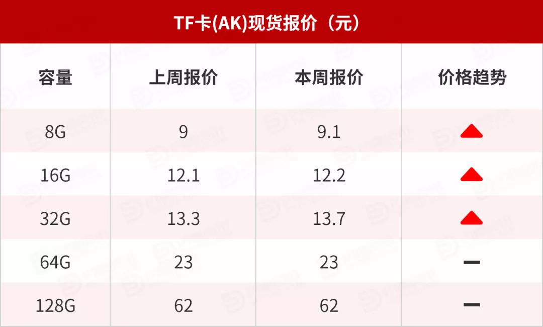 TF卡(AK)现货大致报价,除64G和128G容量保持不变,其它容量呈现上涨态势,涨幅区间在1-3%。
