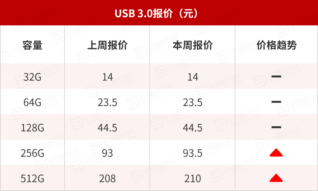 USB 3.0半成品现货大致报价,除256G和512G容量保持不变,其它容量呈上涨态势,涨幅1%左右。