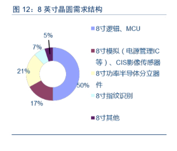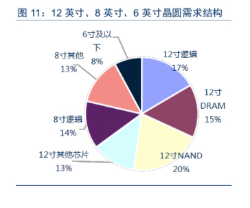 从晶圆需求总量来看,据中信证券估算,包括NAND、DRAM在内用于存储市场的 12 英寸晶圆需求约占总需求 35%,8英寸晶圆需求约占总需求 27%,用于逻辑芯片的 12 英寸晶圆需求约占 17%。需求上看,目前存储器贡献晶圆需求最多,8英寸中低端应用其次。