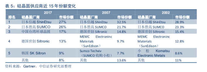 值得一提的是,与前四大厂商不同,SK Siltron仅供应韩国客户。除此之外,还有法国Soitec、台湾地区台胜科、合晶、嘉晶等企业,但份额相对较小。可以说,目前在硅晶圆市场,日本占据着最大优势,近15年来,日本厂商始终占据硅晶圆50%以上市场份额。