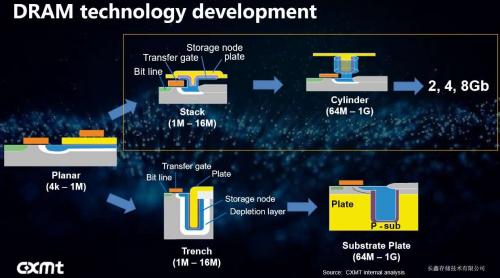 而值得一提的是,长鑫从奇梦达手中接过堆叠式架构的相关技术专利,并通过引入双重图案对准(SADP)以及四重图案对准(SAQP)等技术,并从内外双面电容逐渐走到外部的单面积电容(柱状电容),成功将奇梦达的 46nm 平稳推进至 10nm。