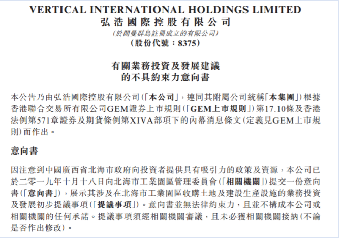 10月21日,弘浩国际控股发布公告称,该公司已于10月18日向广西省北海市工业园区管理委员会提交一份意向书,展示其涉及在北海市工业园区收购土地及建设生产设施的业务投资及发展初步提议事项。