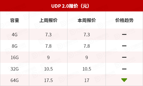 UDP 2.0现货大致报价:除了64G容量下跌3%外,其它容量保持不变。