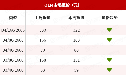 内存OEM本周市场报价:D4方面,除了4G容量报价保持不变,其他容量呈现下跌姿态,跌幅区间在1%-2%,D3方面全线下跌,跌幅区间在4%-6%。