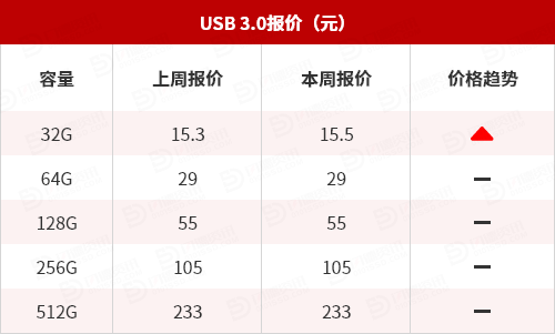 USB 3.0报价:除了32G上涨1%外,其他容量保持不变。