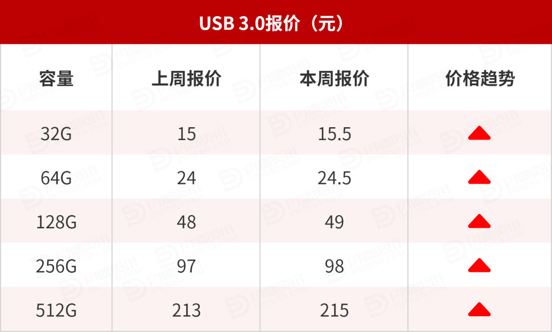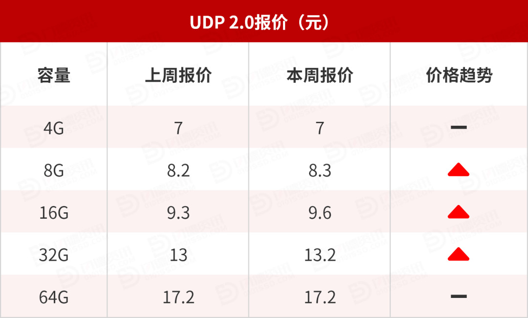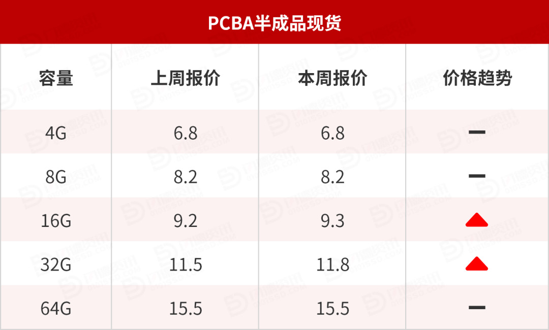 PCBA 2.0半成品现货大致报价,除了16G和32G容量上涨,涨幅在1-3%,其它容量保持不变。