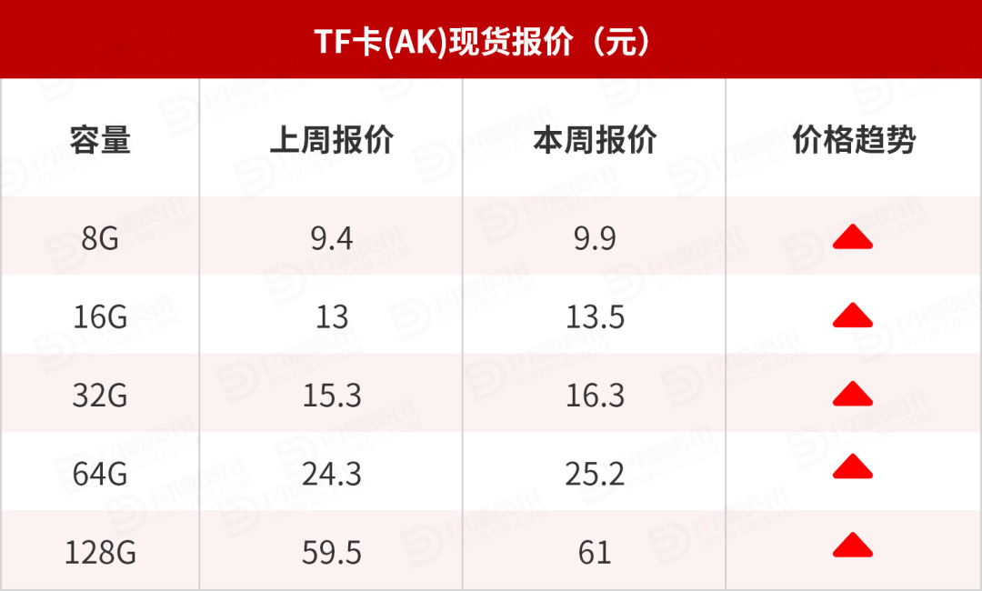 OEM PCBA 120G/240G/480G/960G报价(无包装外壳等):95/155/275/495左右。FLASH颗粒市场原厂无现货供应市场,国产紫光GOOD DIE现货开始减少,价格拉高。测试货供应相当有限,价格坚挺。拆机货供应无明显增加。INK DIE WAFER货源很少,惜售明显,成交有限!本周USB市场本周价格整体稳中有升。2.0产品需求偏弱,买气减少,出现个别少量套现行为,但整体供应无明显变化。3.0产品整体有所上涨,颗粒少,主控缺,需求稍微正常,可适当跟进。TF卡本周市场较火热,整体炒作气氛浓烈。前期货源少,短期适合做的WAFER产品惜售,再加上主控缺货严重,可重点关注!