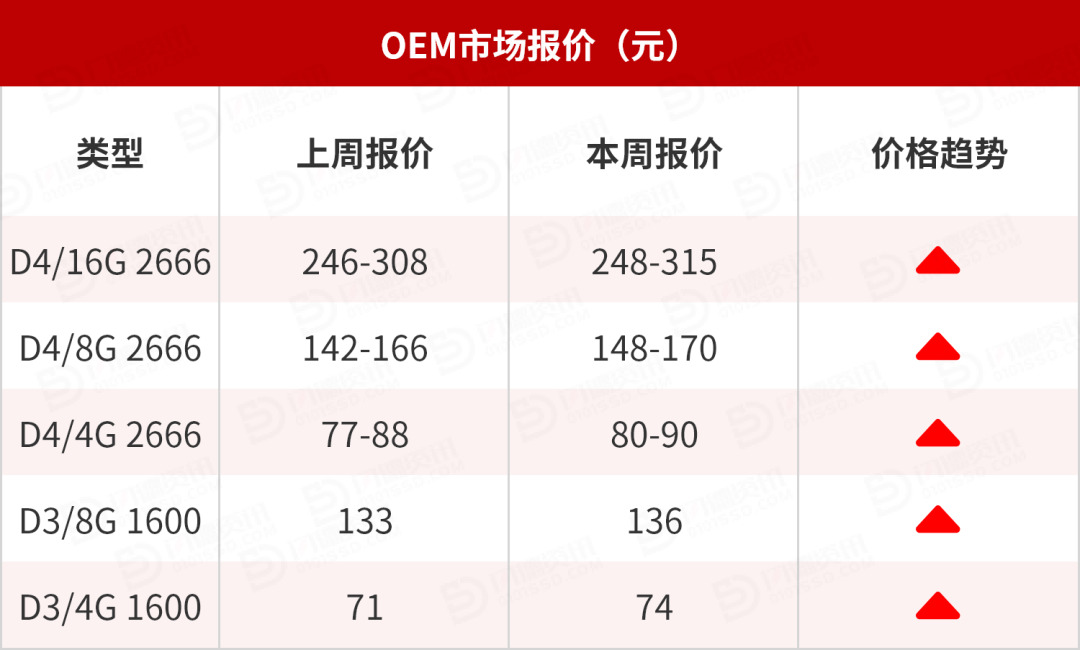 UDP 2.0现货大致报价,除了4G和64G容量保持不变,其它容量呈上涨态势,涨幅在1-3%。TF卡(AK)现货大致报价,所有容量呈上涨态势,涨幅区间在3-7%。USB 3.0半成品现货大致报价:所有容量呈上涨态势,涨幅区间在1-3%。内存OEM本周市场报价:D4板块,所有容量呈上涨态势,涨幅区间在1-4%,D3板块,所有容量呈上涨态势,涨幅区间在2-4%。D4 16G/2666 :310-442左右