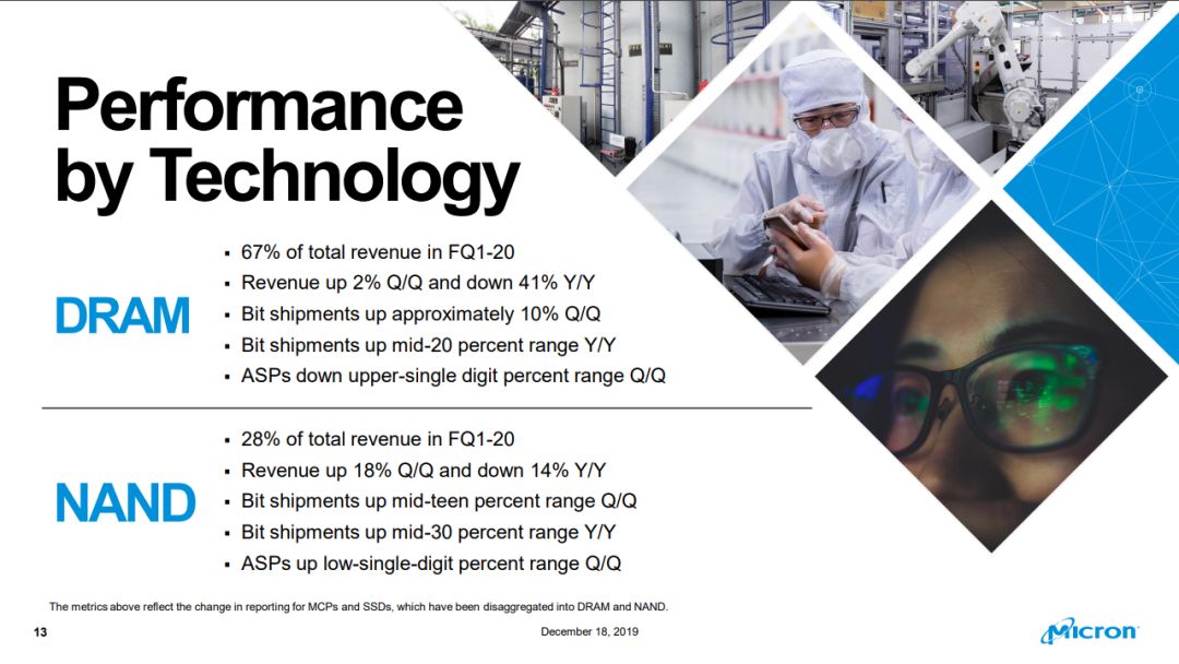 2020年第一财年镁光NAND Flash业务营收14.2亿美元,占总营收的28% ;2019年同期DRAM营收16.6亿美元,减少14.4%。