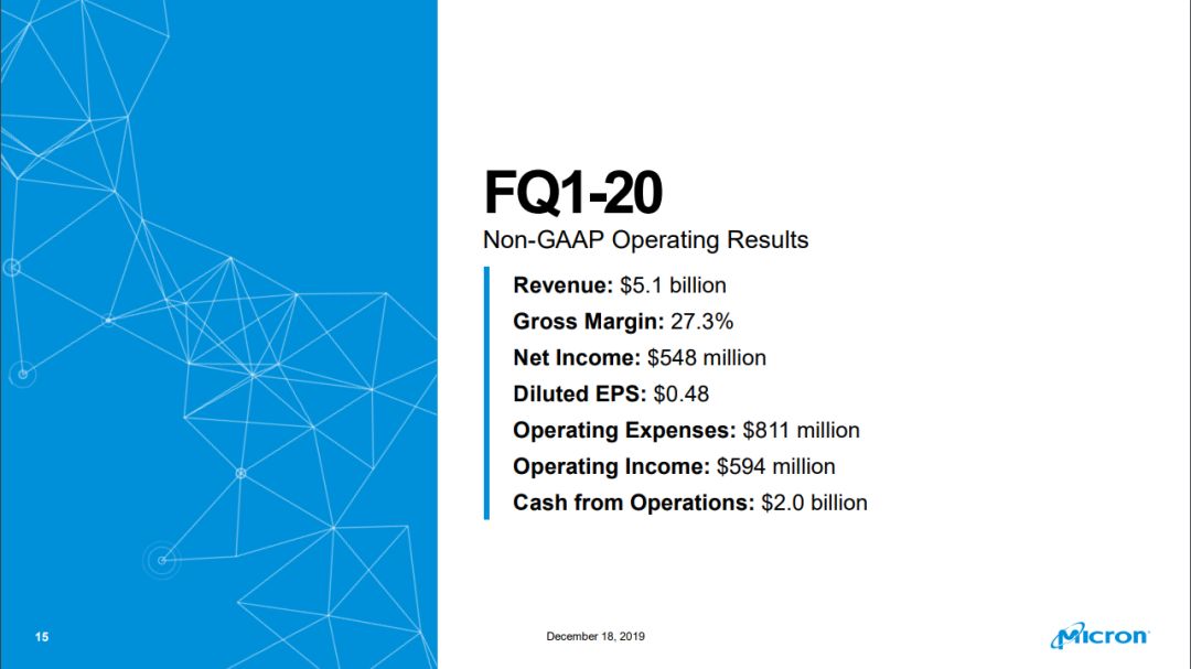 镁光发布了截止2019年11月28日的2020财年第一季度业绩,营收51.4亿美元,同比减少35%。GAAP净收入为4.91亿美元,同比下滑85%。摊薄每股收益为0.43美元,去年同期为2.81美元。不按照美国通用会计准则,调整后每股摊薄收益为0.48美元,超出预期,相比之下去年同期为2.97美元,上一季度为0.56美元。