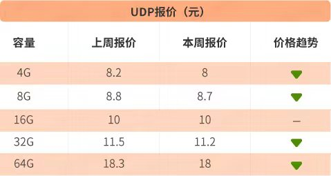 UDP现货报价除了16G价格不变外,其余容量小幅下跌,跌幅在0.1-0.3元间。