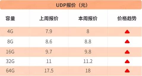UDP报价全面回升,各容量涨幅在0.1-0.5元间,64G涨幅最大,为0.5元左右。