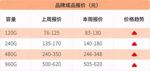 品牌成品报价本周全面回升,各容量价格涨幅在5-10元间,以240G涨幅最大。