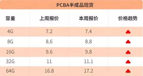 PCBA半成品也呈全线上涨趋势,各容量涨幅在0.1-0.4元间。
