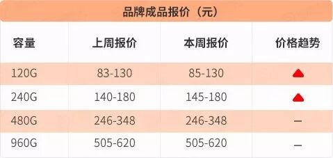 品牌成品报价,低容量120G/240G价格明显上涨,涨幅在2-5元,大容量相对稳定,与上周保持一致。