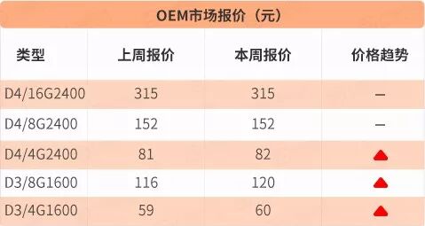 内存OEM市场报价D4价格保持平稳,仅4G2400有1元左右的上涨,D3全线上涨,涨幅在1-4元间,主要因颗粒现货暂无法入关所致。