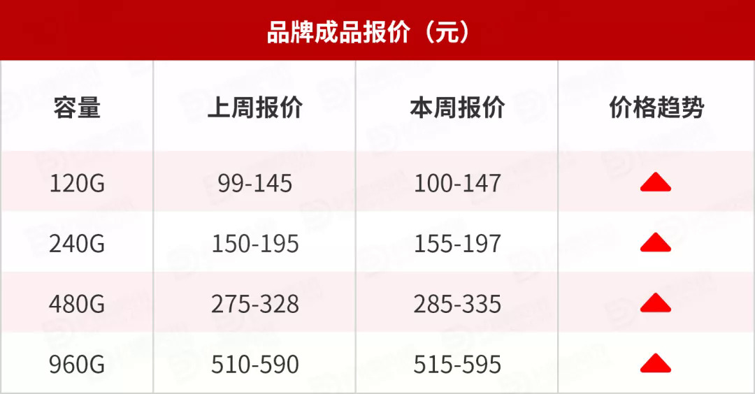 本周品牌大致报价,所有容量全线上涨,涨幅区间在1-4%。