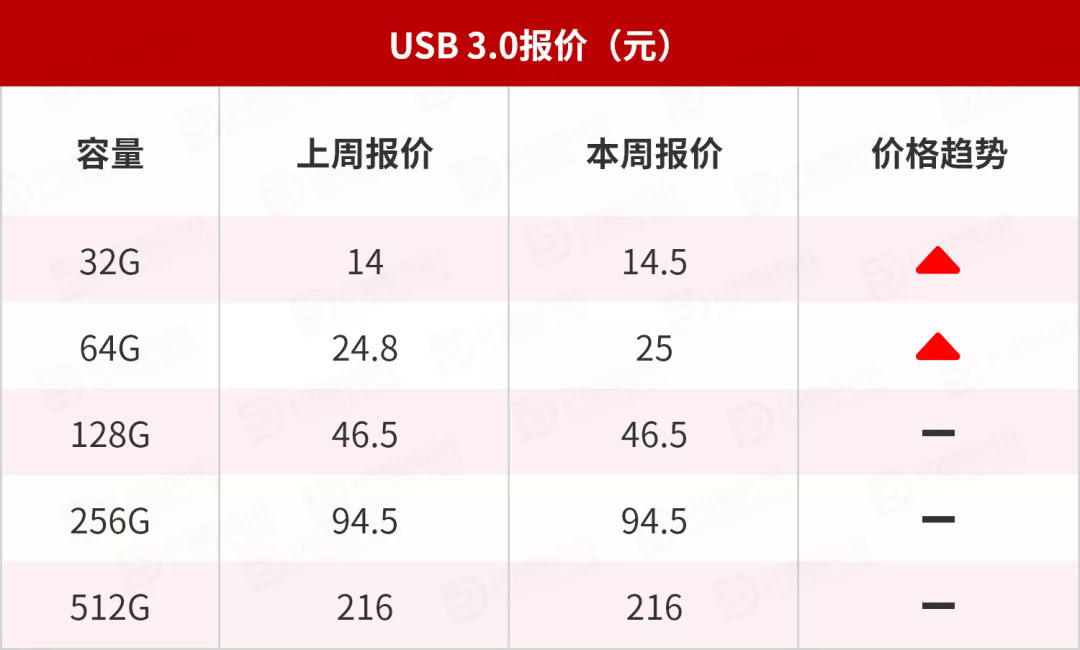 USB 3.0现货大致报价除了32G和64G容量上涨,涨幅区间在1-4%,其他容量保持不变。