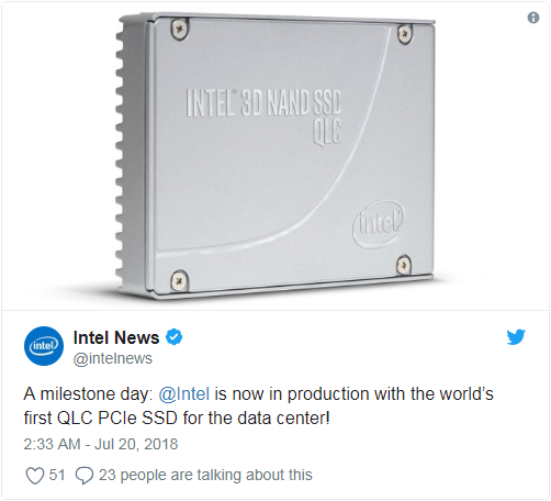 与此同时,英特尔最近也成为了业内首个大规模生产 QLC SSD 的企业,为更便宜的高密度 NAND 闪存供应敞开了机遇。