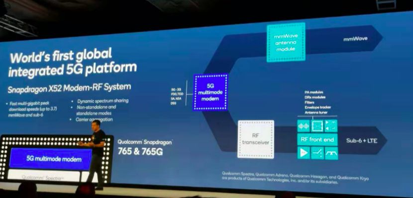 骁龙765&765G平台集成骁龙X52基带-射频系统。能够提供在毫米波和Sub6频段下3.7GHz的峰值下载速率,具备灵活的频谱共享能力,支持NSA/SA以及载波聚合。
