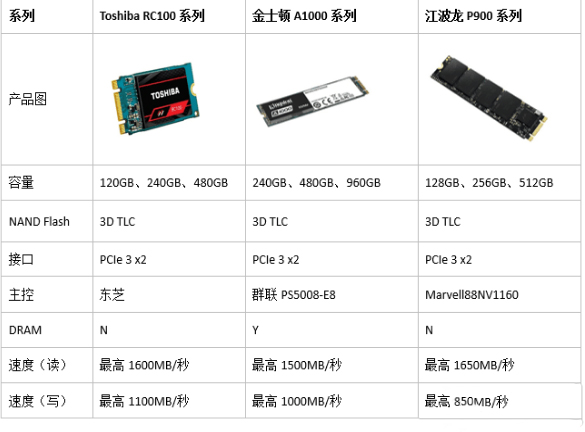 以PCIe SSD 256GB容量60-70美金的价格计算,经过优化后的PCIe SSD成本可以降低5%-10%,进一步缩短了与SATA SSD之间的价差。2018年东芝RC100、金士顿A1000、江波龙P900等PCIe SSD采用DRAM-less设计或PCIe Gen3x2传输接口,在同等容量上可以做到与SATA SSD同价,同时具备2倍于SATA SSD的性能表现,这对于PCIe SSD的市场普及具有很大的推动力。