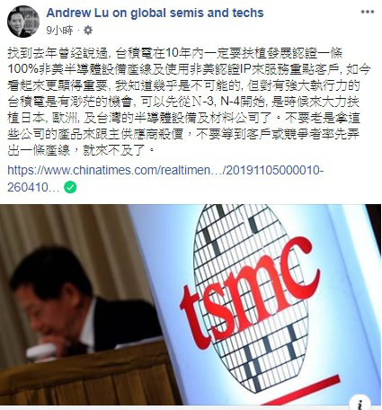 此前,陆行之在个人脸书上表示,曾经说过台积电在 10 年内一定要扶植发展认证一条 100% 非美 (非美系) 半导体设备产线,及使用非美认证 IP 来服务重点客户,如今看起来更显得重要。