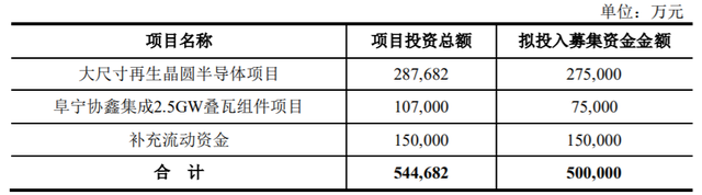 随后上述定增案被调整为募资不超过32.82亿元,发行数量不超过10.12亿股,扣除发行费用后,募集资金拟全部用于大尺寸再生晶圆半导体项目以及补充流动资金,其中大尺寸再生晶圆半导体项目拟投入募集资金25.5亿元,剩余7.32亿元用于补充流动资金,并获得了证监会审核通过。