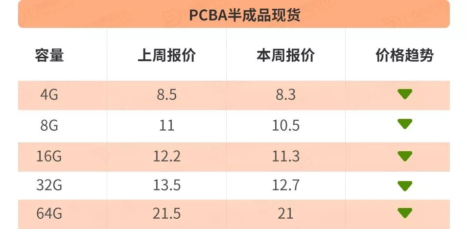 PCBA半成品方面,各容量报价较上周均有所下降,降幅在0.2-0.9元左右。