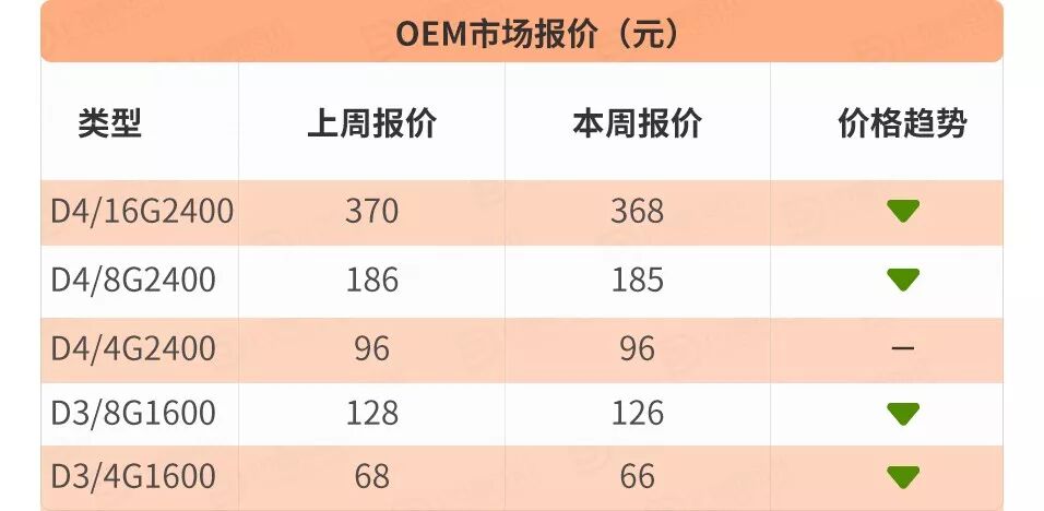 D4方面:D4/4G2400报价相对稳定,D4/8G2400价格较上周微降1元左右,D4/16G2400价格较上周下降2元左右。