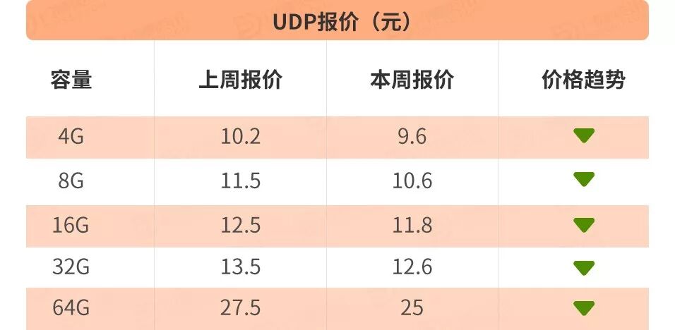 本周UDP报价较上周呈下降趋势,降幅在0.6-2.5元左右,降价幅度拉大,其中64G降幅最大,在2.5元左右。