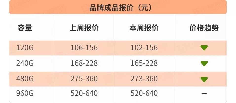 品牌成品报价除了960G高容量价格较稳定,其他容量价格较上周有不同程度下跌,跌幅在2-4元左右。
