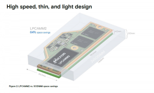 美光将LPDDR5X DRAM整合到全新LPCAMM2规格尺寸中,相较SODIMM产品,在PCMark 10基本工作负载等方面可降低61%功耗,提升高达71%效能,并节省64%的空间。