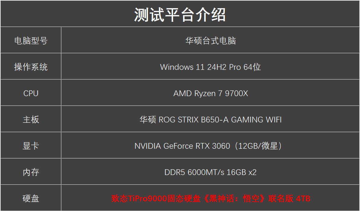 这次测试所用平台是华硕ROG STRIX B650-A GAMMING WIFI主板搭配AMD Ryzen 7 9700X处理器,以及2根6000MT/S DDR5内存、RTX3060显卡,并将致态TiPro9000固态硬盘《黑神话:悟空》联名版插入唯一的M.2 PCIe 5.0 x4插槽,靠近CPU位置。