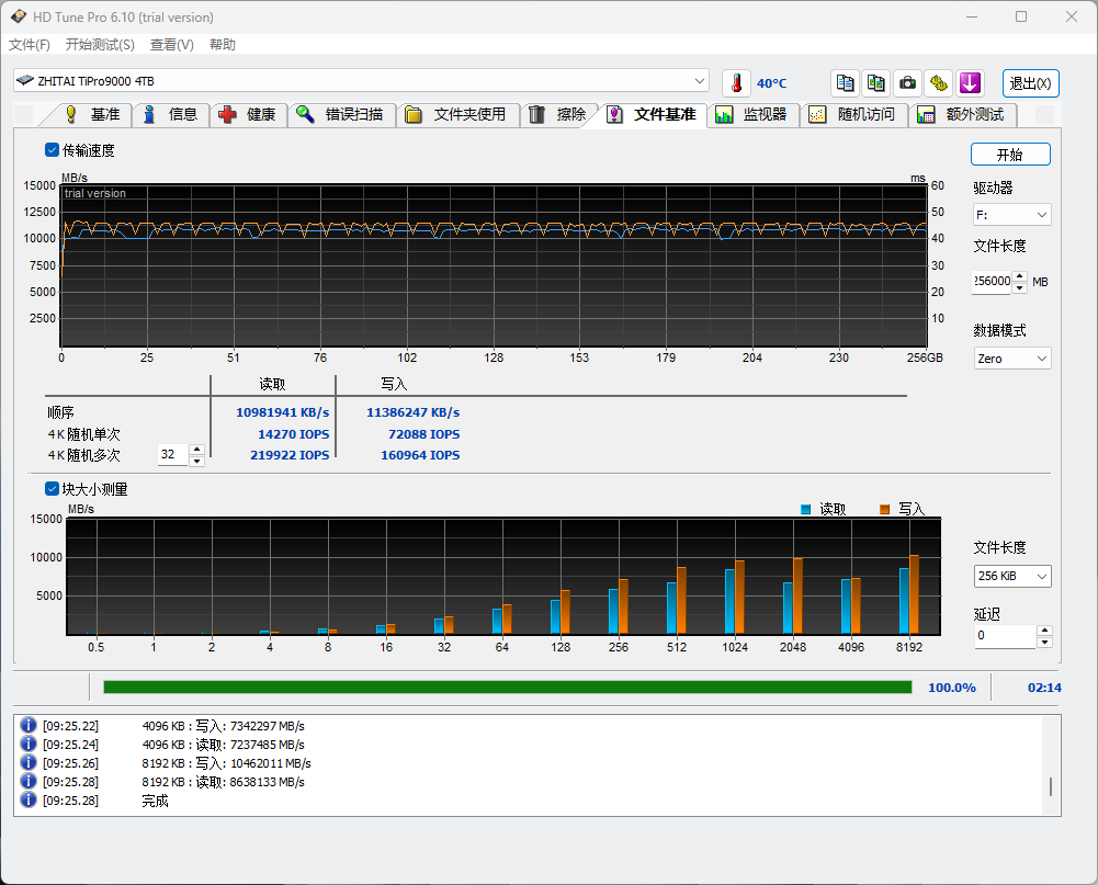 在HD Tune Pro测试中,设置256GB的文件长度,读写速度均稳定在11000MB/s左右。另外,测试过程中温度只有40°C,温控表现值得表扬。