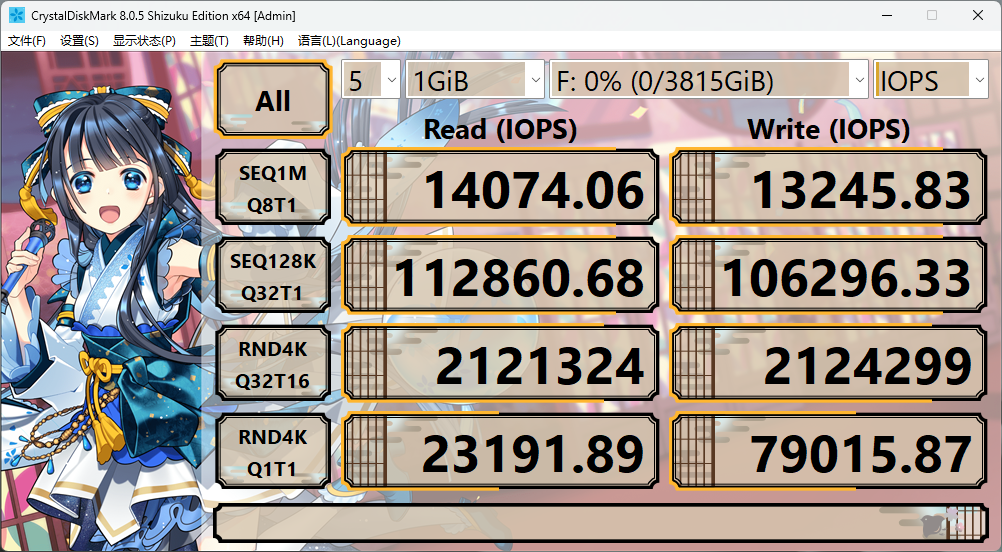 用CrystalDiskMark进行读写带宽测试,软件版本号为8.0.5,文件大小为1GiB,最终测得在Q8T1下顺序读写速度为14757MB/s和13889MB/s,比官方给出的数据要高出不少,这种反向虚标的操作真是给到用户意外之喜。