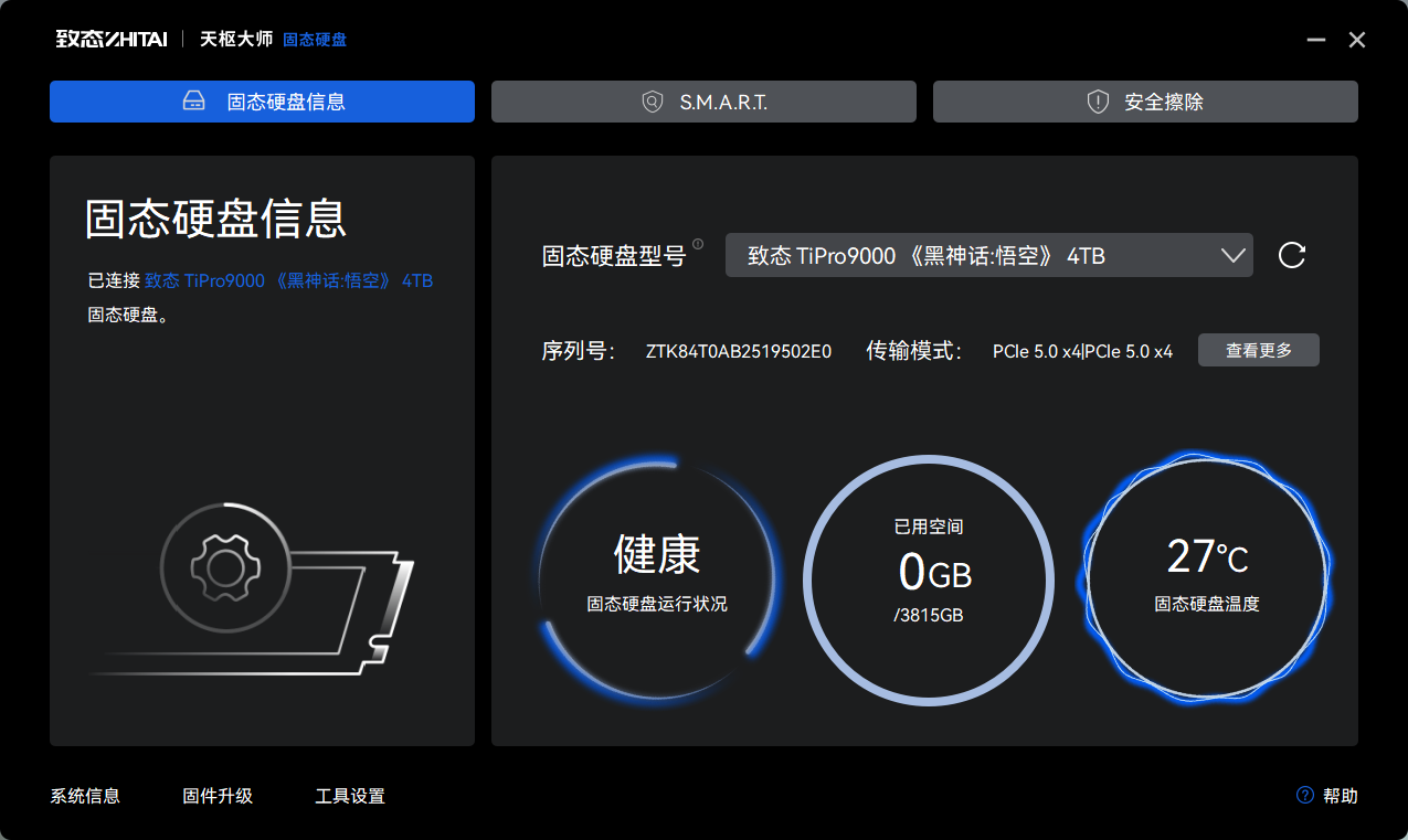 除了第三方软件外,致态官方也有天枢大师可以查看和管理固态硬盘状态,并且支持固件升级、安全擦除等功能。而致态TiPro9000固态硬盘《黑神话:悟空》联名版官方提供5年质保和最高达2400TBW耐用等级,给足安全感。