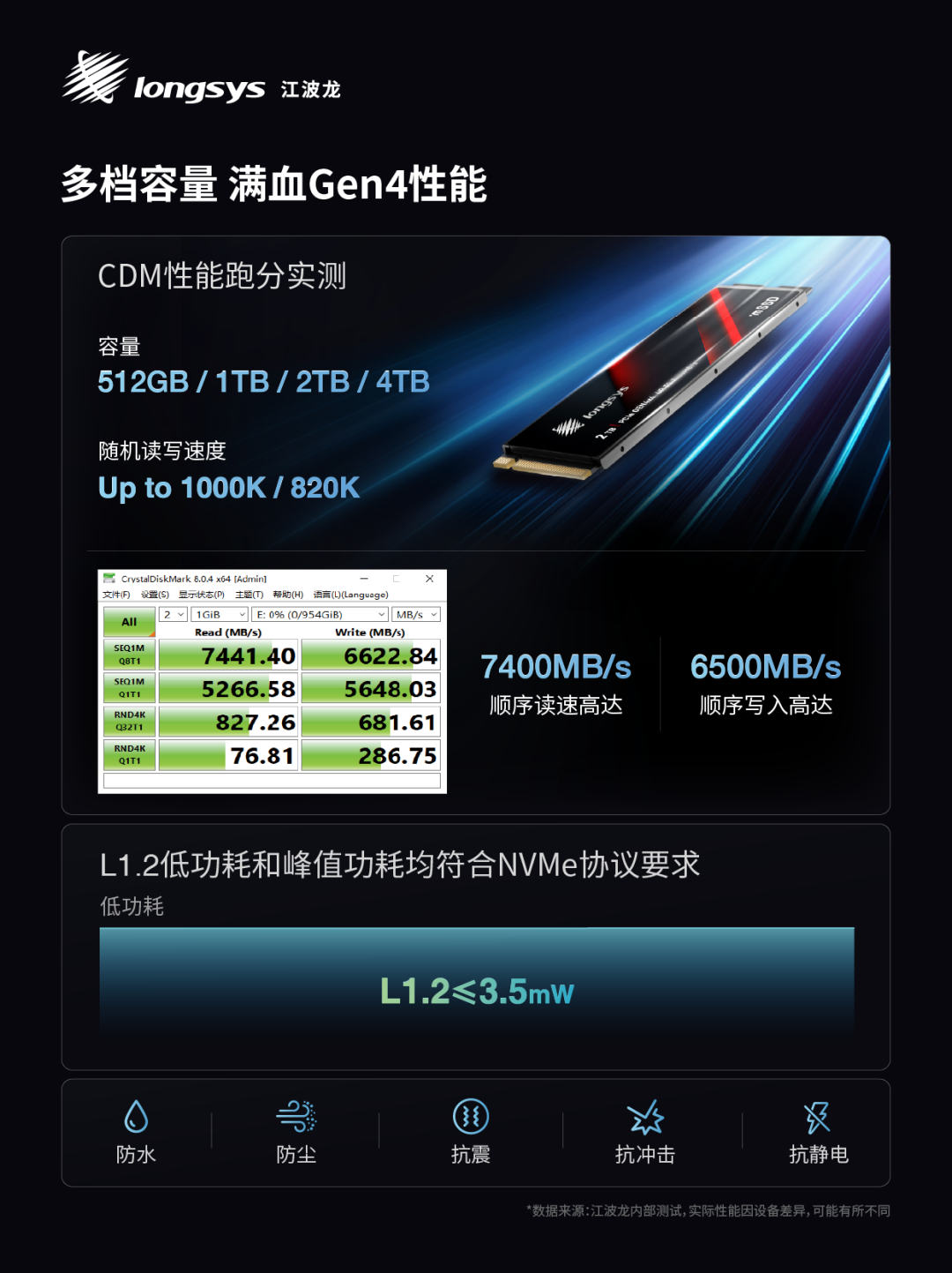 在20×30×2.0 mm的紧凑封装中,重量只有2.2g的mSSD仍能实现PCIe Gen4×4接口下的主流水平性能——顺序读取最高可达7400MB/s,写入最高6500MB/s,4K随机读取速度最高可达1000K IOPS;4K随机写入速度最高可达820K IOPS,整体性能表现稳定。