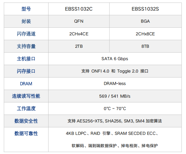 从官方信息可知,本征EBSS1032C 是一款DRAM-less主控芯片,支持ONFI 4.0与Toggle 2.0接口,连续读写性能达 569/541 MB/s。容量方面,QFN封装最大支持2TB,BGA封装可支持到8TB。