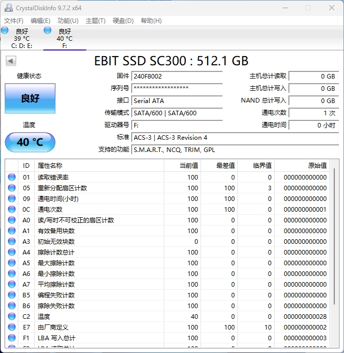 根据CrystalDiskInfo识别到的信息,测试盘型号为EBIT SSD SC300(以下简称SC300),固件版本240F8002,在SATA3接口下最高传输速度为6Gbps,支持S.M.A.R.T.、NCQ、TRIM、GPL等特性。