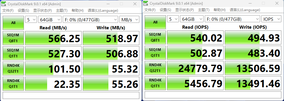 在侧重大文件与持续读写场景的 64GB 容量测试中,许多 SSD 即便在顺序读写环节也难以保持稳定,常见出现明显的性能衰减。而 SC300 的整体表现却相当稳健:顺序读取速度达到566MB/s、顺序写入 518MB/s,速度基本保持不变,4K 随机读写读取速度 101.5MB/s、写入 55.32MB/s,但IOPS 仍维持在 25K 与 14K 的水平,展现出同级产品中难得的持续性能与稳定性。