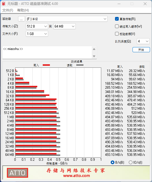 ATTO是一款磁盘传输速率检测软件,该软件通过不同大小的数据测试包(0.5KB至8192KB)进行读写测试,并以柱状图直观展示结果,可分析文件大小对磁盘读写速度的影响。